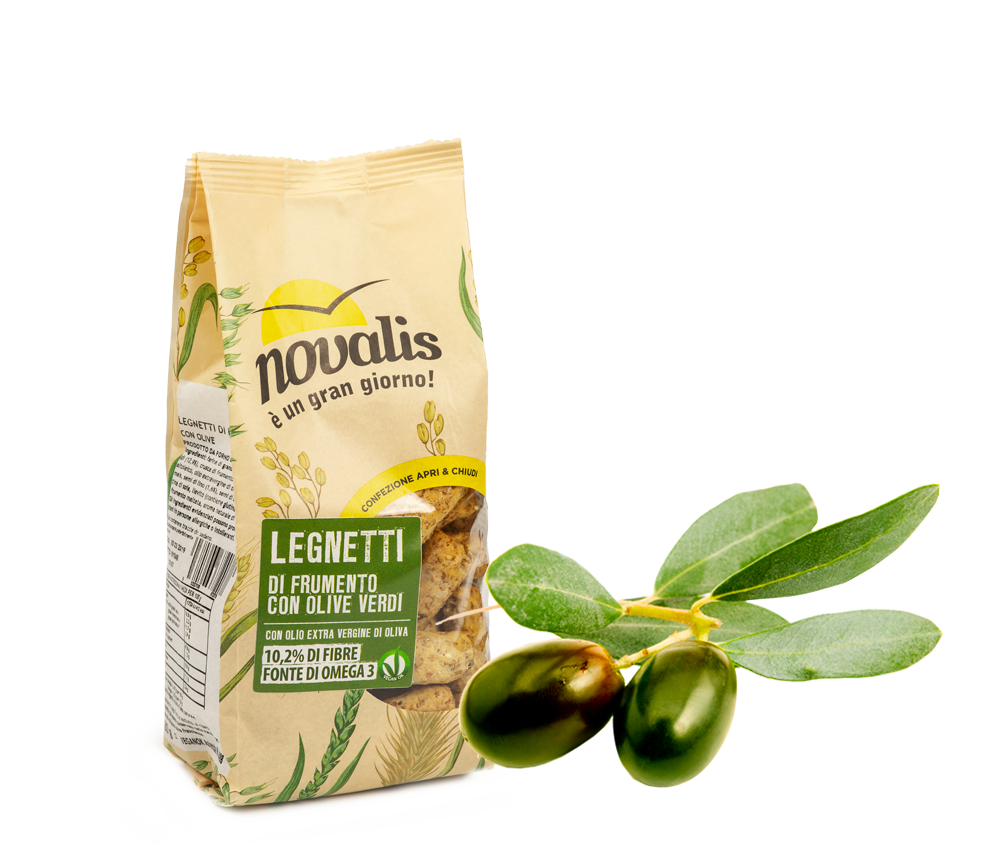 wheat flour type “0”, wheat bran (10.8%), green olives (12.9%), high oleic sunflower oil, extra virgin olive oil (3.2%), corn foil, flax seed (1.62%), sesame seeds, salt, soy lecithin, natural yeast (contains gluten), malted wheat flour, natural rosemary flavor. May contain traces of celery.