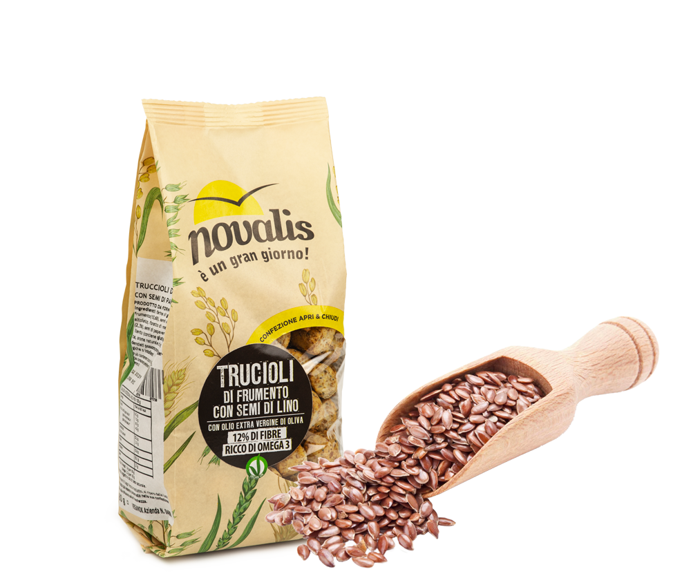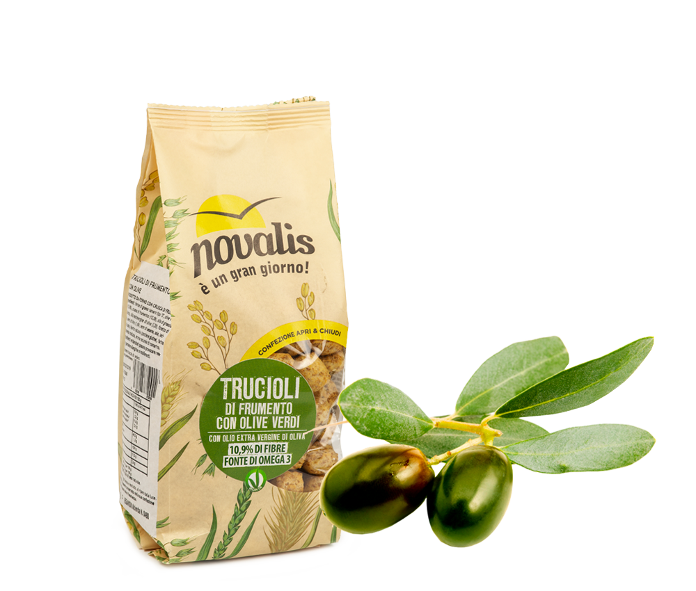Ingredients: “0” soft wheat flour, wheat bran (12%), green olives (12.9%), high oleic sunflower oil, extra virgin olive oil (3.2%), corn floret, flax (1.62%), sesame seeds, salt, soy lecithin, natural yeast (contains gluten), malted wheat flour, natural rosemary flavor. May contain traces of celery.