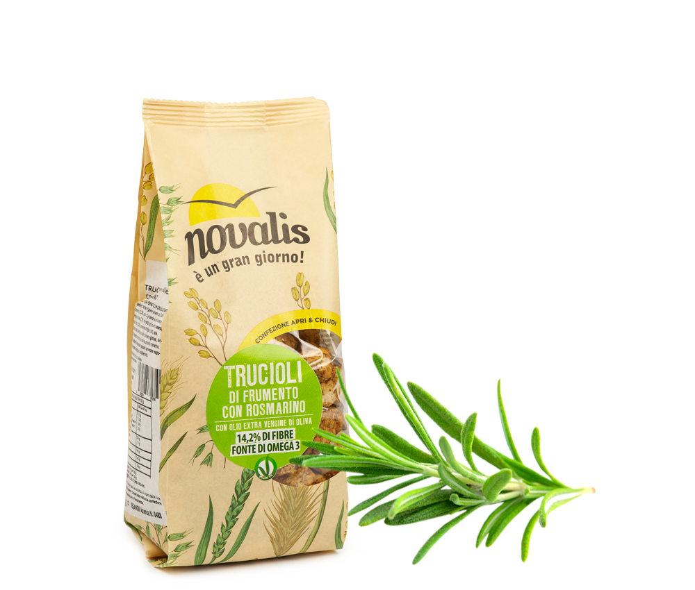 wheat flour type “0”, wheat bran (12.5%), high oleic sunflower oil, corn foil, extra virgin olive oil (2.7%), sesame seeds, linseed (1.2%), rosemary in leaves (0.9%), salt, soy lecithin, yeast (contains gluten), malted wheat flour, natural rosemary flavor. May contain traces of celery.